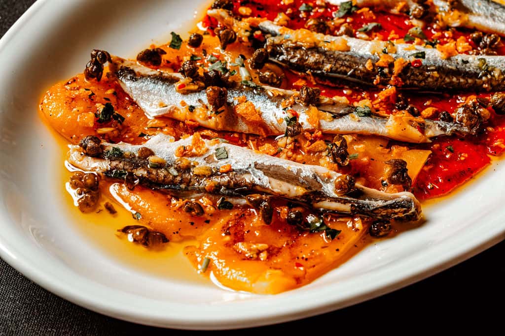 Fresh anchovies that are cleaned and marinated in vinegar. They are tender and have a mild, delicate flavor.